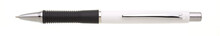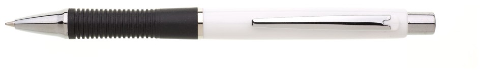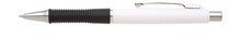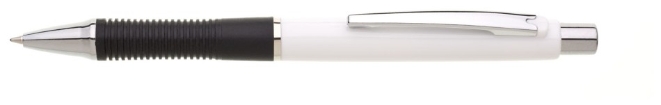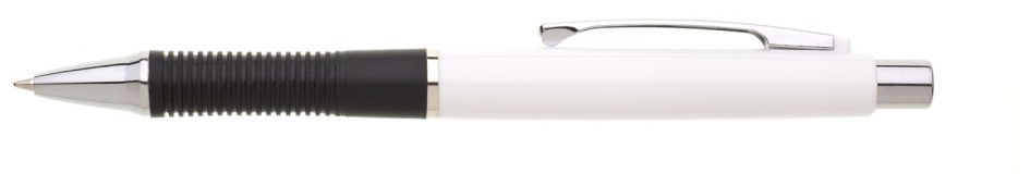 Kuličkové pero PRIOLA bílá, má úchop z černého, pogumovaného vroubkovaného materiálu. Doplňky pera jsou ve stříbrné barvě.