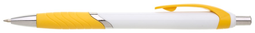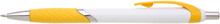 Plastová propiska s bílým tělem s žlutým úchopem a klipem a stříbrnými doplňky.