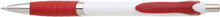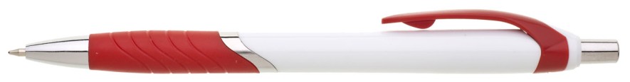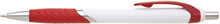 Plastová propiska s bílým tělem s červeným úchopem a klipem a stříbrnými doplňky.
