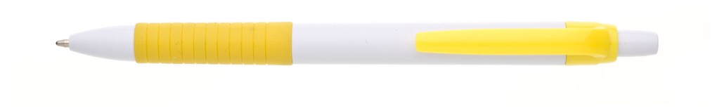Propiska s bílým tělem, žlutým gripem a klipem, náplň modře píšící.