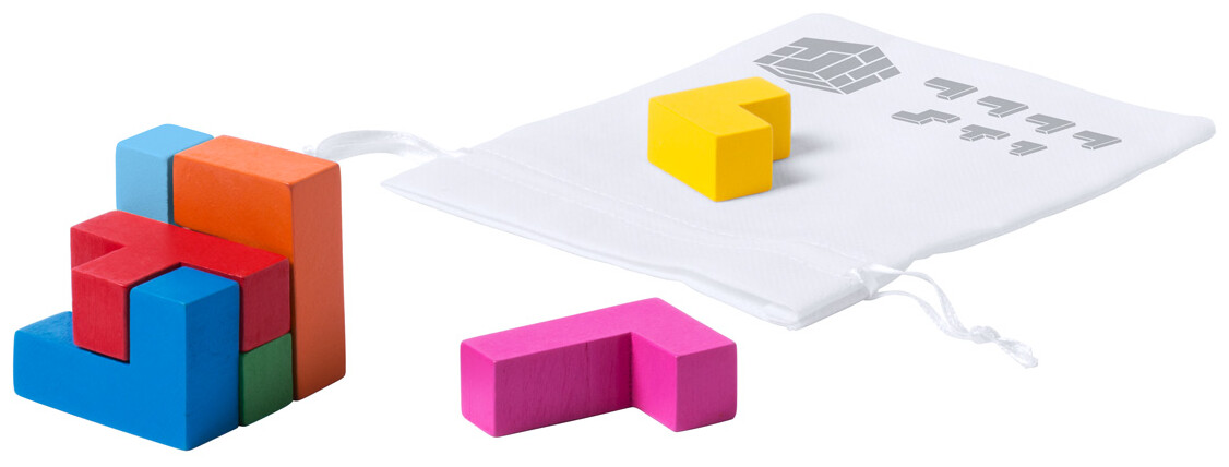 Dřevěná, barevná skládací puzzle kostka, ve váčku z netkané textilie o rozměrech 123x150 mm.