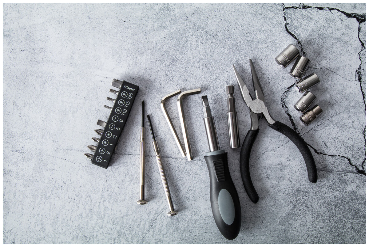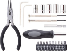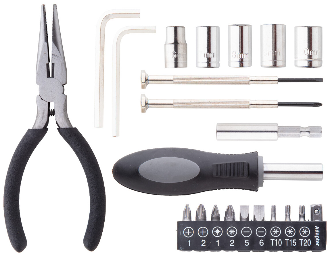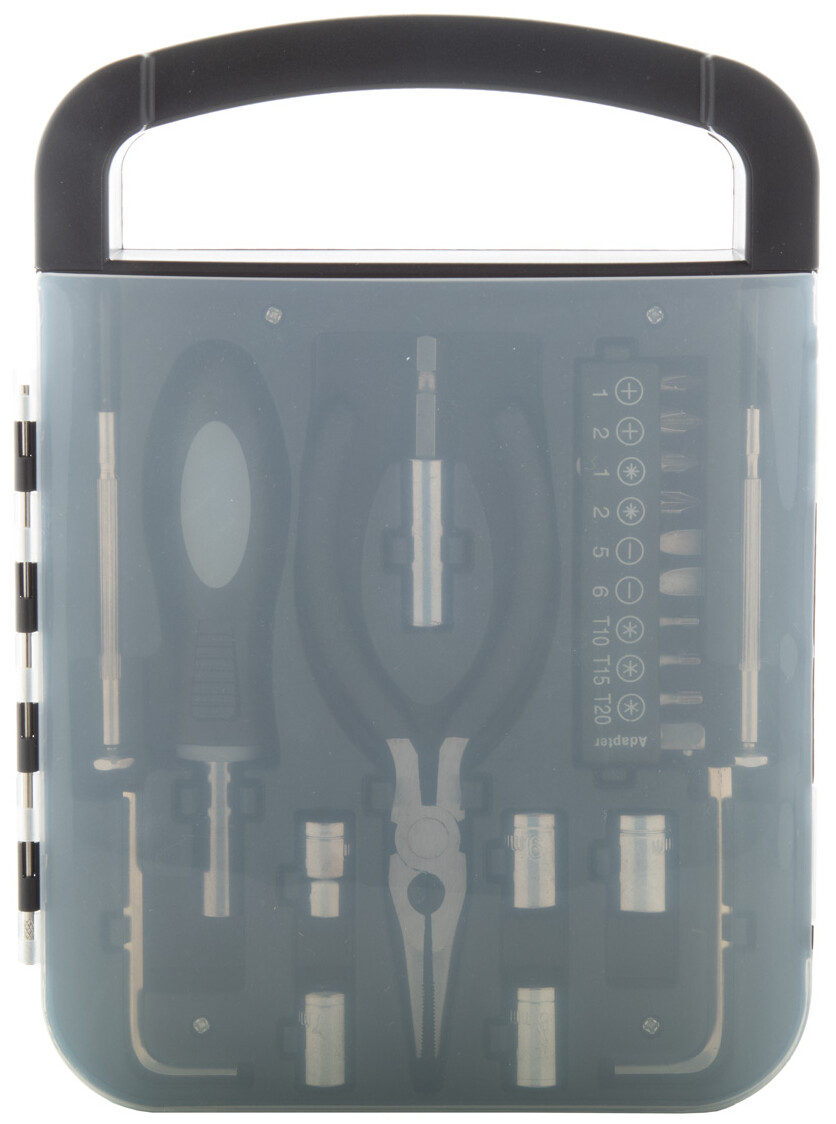 22dílná sada nářadí v plastovém pouzdře. Obsahuje 2ks šroubováků, 1ks kombinovaných kleští, 1 ks držáku, 2 ks dlátek, 5 ks hlavic, 10 ks bitů.