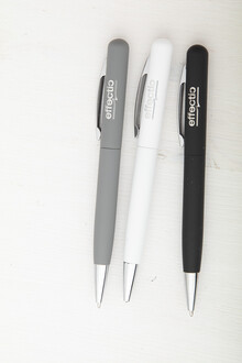 Kovové twist kuličkové pero s pogumovaným povrchem a modrou náplní. Speciální povrch pro laser stříbrného loga.