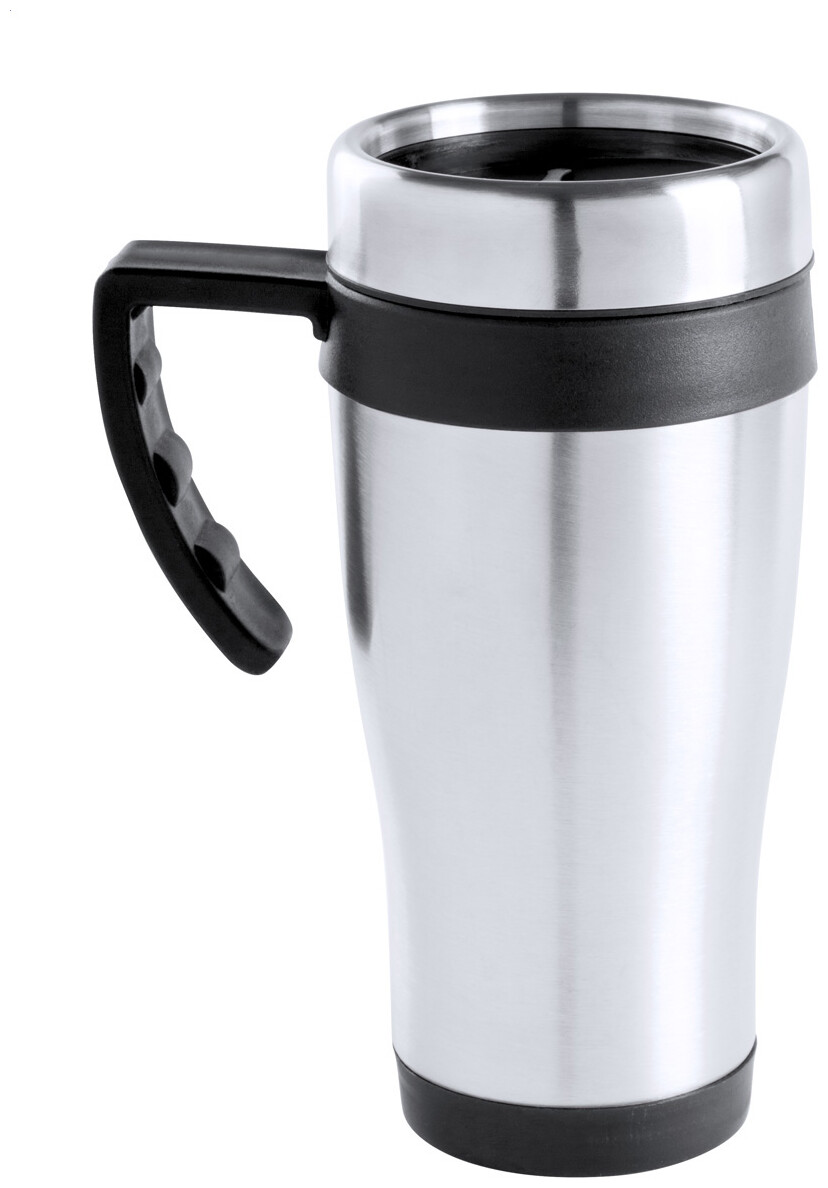Nerezový termo hrnek z nerez oceli s barevnými plastovými částmi a uchem, 450 ml. V dárkové krabičce.