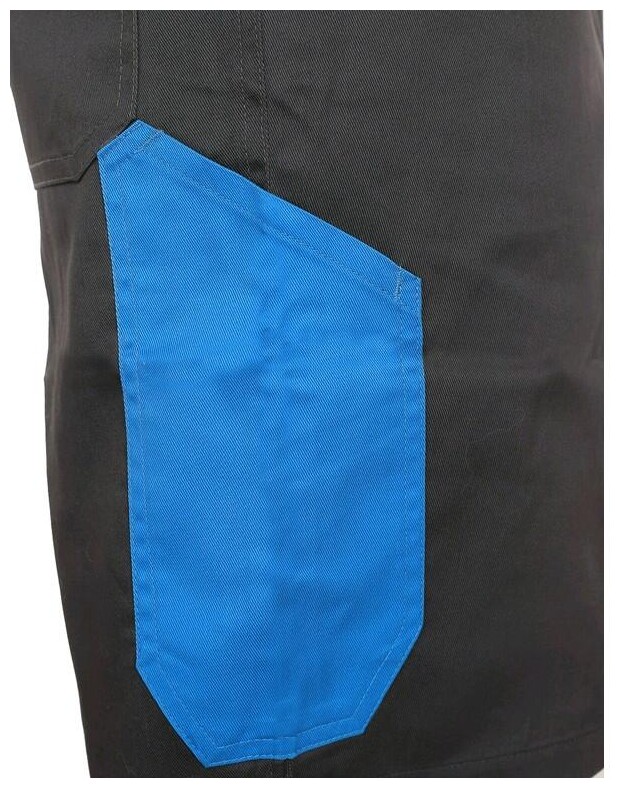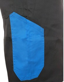 Pánské montérkové kraťasy, pas s poutky na opasek, přední klínové kapsy, boční kapsa s klopou, kapsa na skládací/svinovací metr, zadní jednoduchá kapsa na pravé straně.