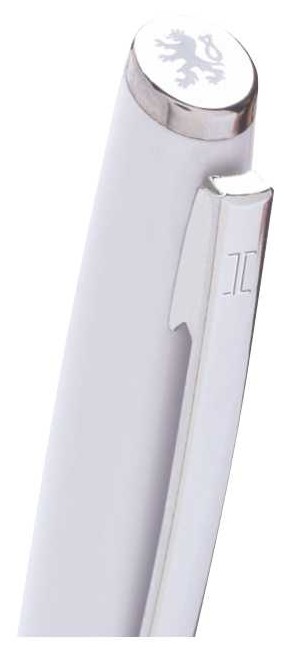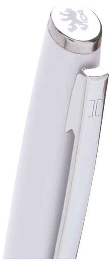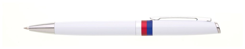 Bílá otočná propiska s trikolórou a tiskem lva. Náplň velkoobsahová, modře píšící.