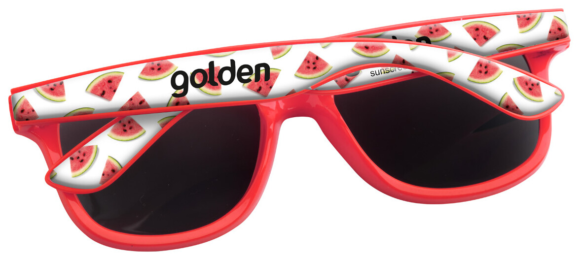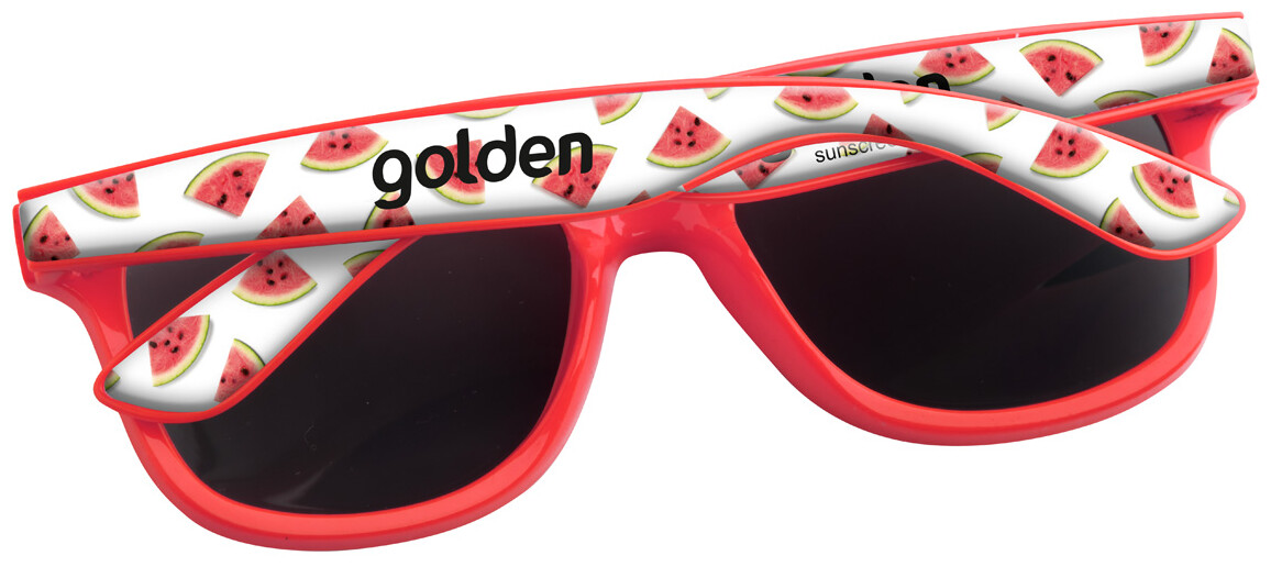 Plastové sluneční brýle se speciálními nožičkami pro epoxy potisk. S ochranou UV 400. Cena zahrnuje epoxy potisk na nožičkách, nezahrnuje tiskovou přípravu. Min. mn.: 100 ks.