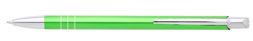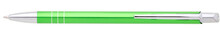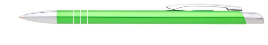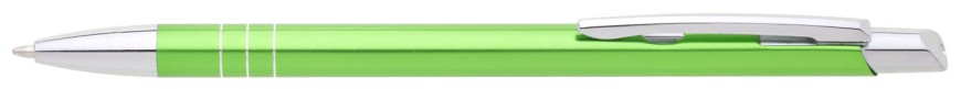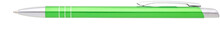 Tenká kovová propiska SOTTI ve světlezelené barvě s chromovými doplňky a třemi tenkými proužky. Náplň X-20, modře píšící.