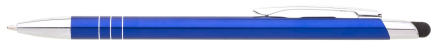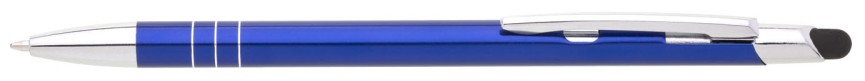 Tenká kovová propiska SOTTI s touch koncem v modré barvě s chromovými doplňky a třemi tenkými proužky. Náplň X-20, modře píšící.