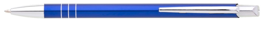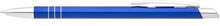 Tenká kovová propiska SOTTI v modré barvě s chromovými doplňky a třemi tenkými proužky. Náplň X-20, modře píšící.