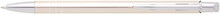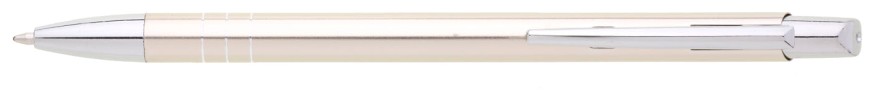 Tenká kovová propiska SOTTI ve zlaté barvě s chromovými doplňky a třemi tenkými proužky. Náplň X-20, modře píšící.