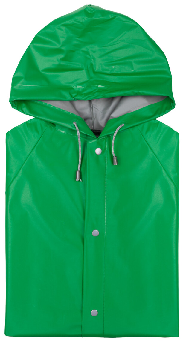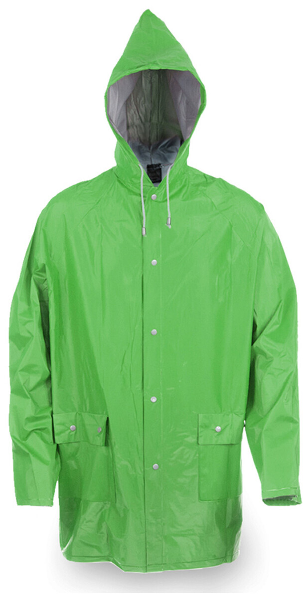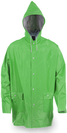 Pláštěnka s kapucí z odolného PVC s žáruvzdornou povrchovou úpravou. Se zapínáním na knoflíky a dvěma předními kapsami.