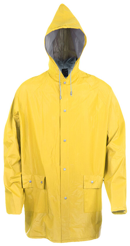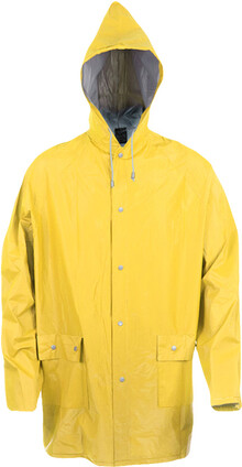 Pláštěnka s kapucí z odolného PVC s žáruvzdornou povrchovou úpravou. Se zapínáním na knoflíky a dvěma předními kapsami.