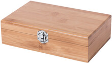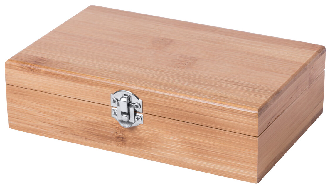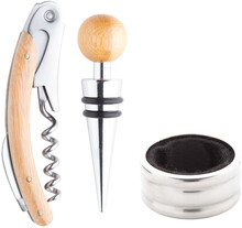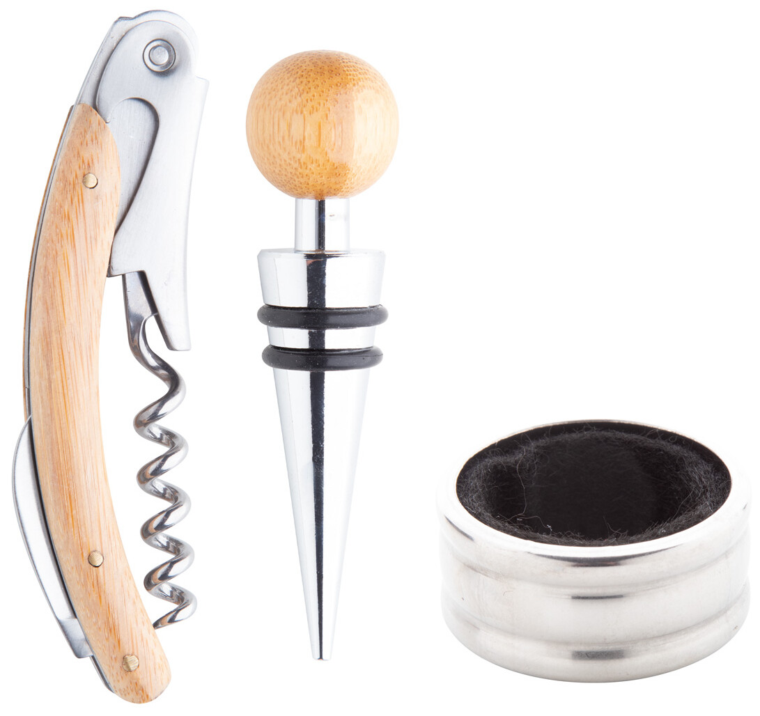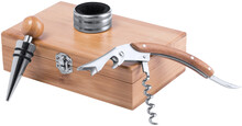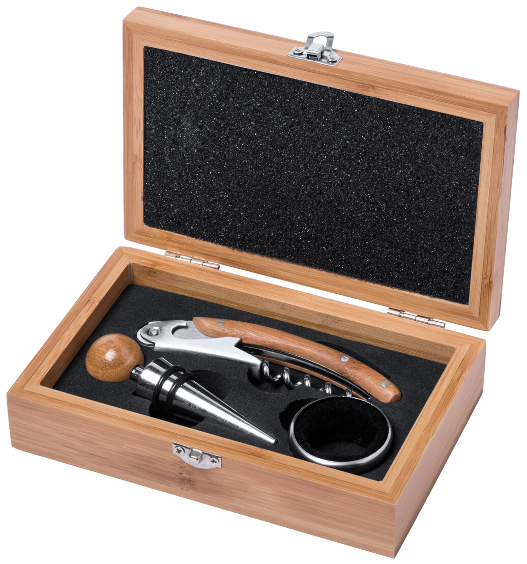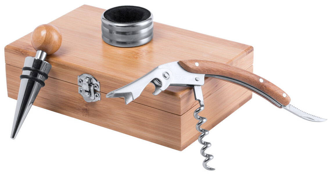 Sada na víno z bambusu s vývrtkou, kroužkem a zátkou v bambusové krabičce.