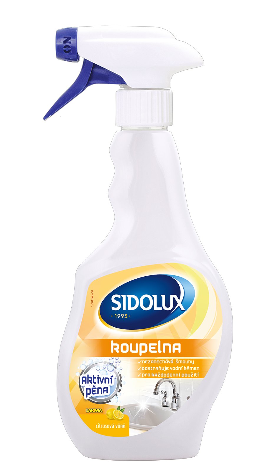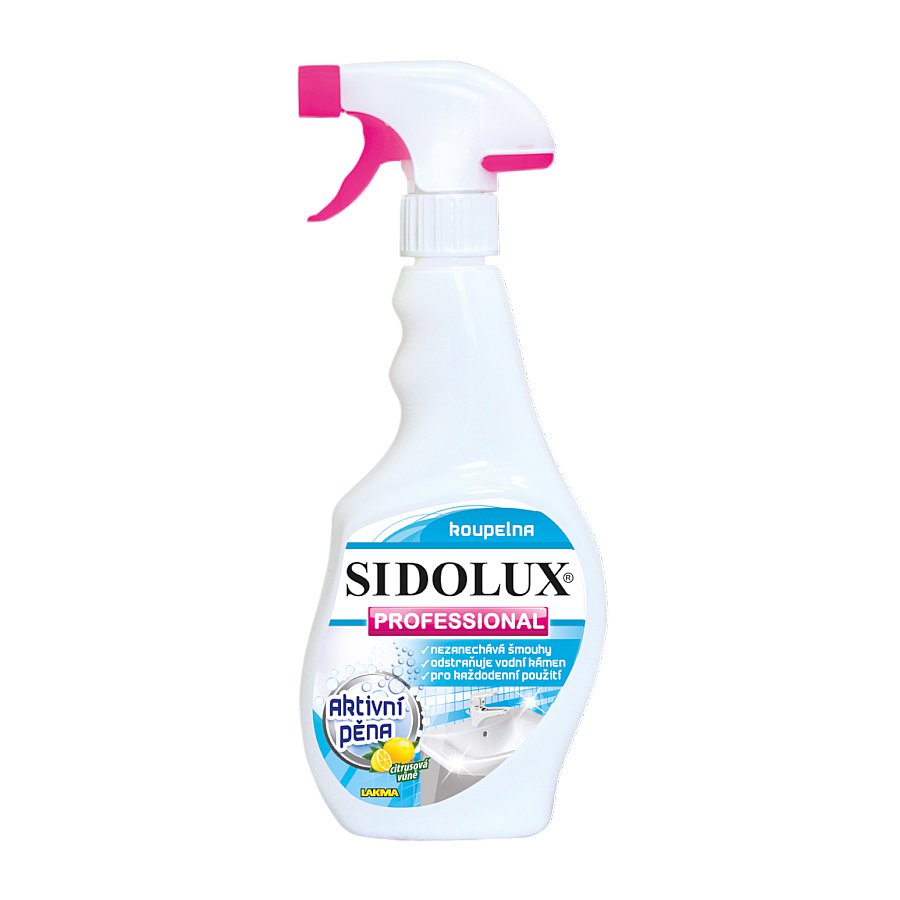 Sidolux Professional Koupelna čistič s aktivní pěnou je čisticí přípravek určený k udržení hygienické čistoty v koupelnách. Díky speciální receptuře snadno a účinně odstraňuje vodní kámen, zbytky mýdla a jiné nečistoty z vodovodních baterií, sprchových zástěn, umyvadel, van. Prostředek vytváří aktivní pěnu, která delší čas působí na čištěný povrch. Zanechává příjemnou svěží ovocnou vůni.