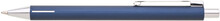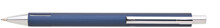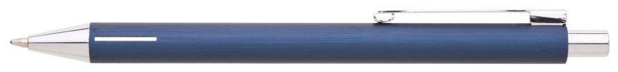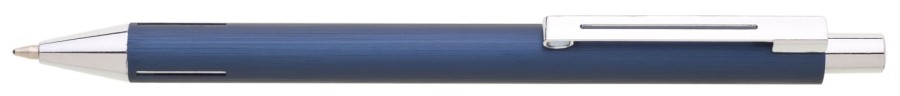 Elegantní hliníková propiska s jemně rýhovaným, temně modrým povrchem a stříbrnými doplňky.